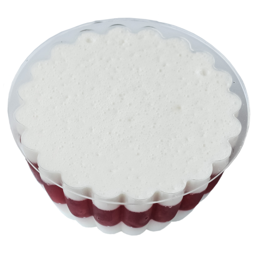 Сочетание желе на основе молочных сливок с желе фруктовым на основе натурального фруктового наполнителя с кусочками красной смородины.